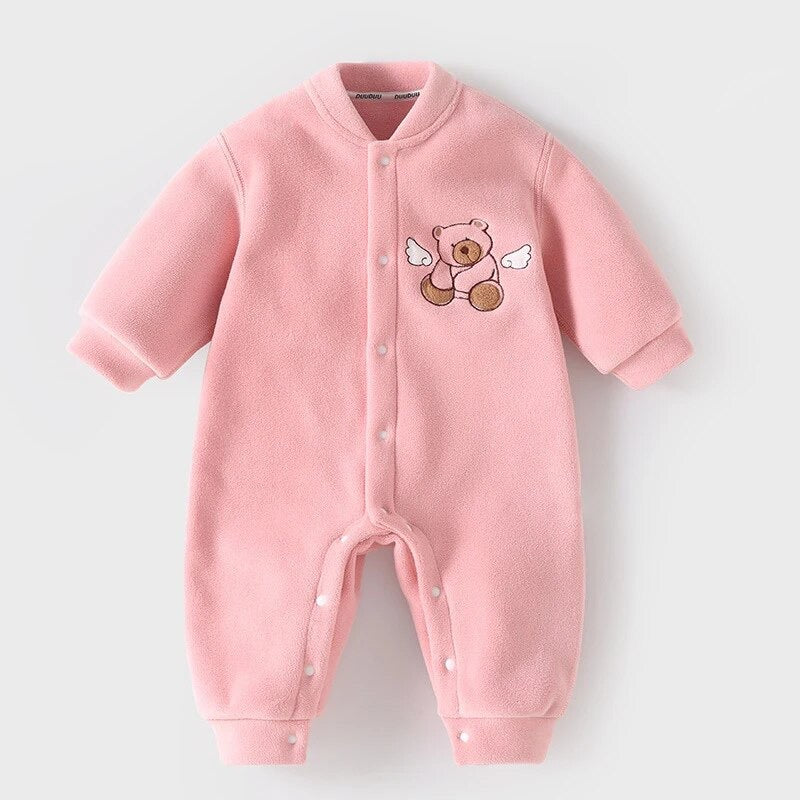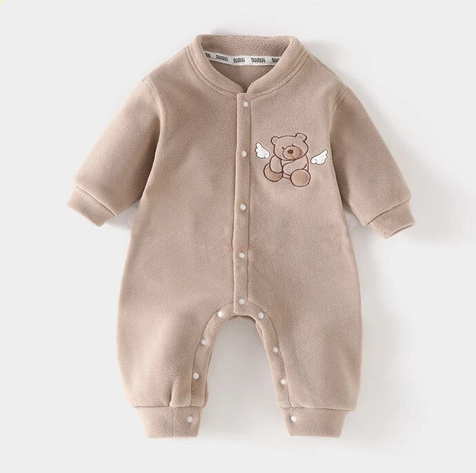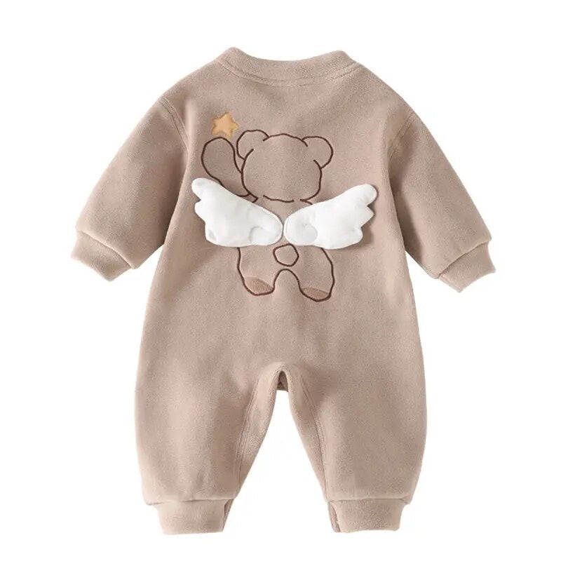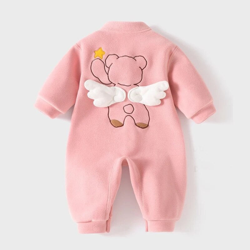 Keep your baby warm and stylish with this adorable fleece winter romper featuring a cute teddy bear with wings embroidery. Made from ultra-soft fleece material, this all-in-one suit is designed for comfort and warmth during cold days.