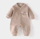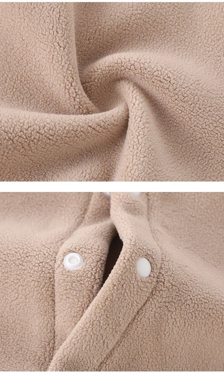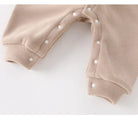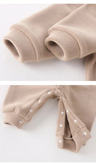 The snap button closure from neck to ankles ensures easy dressing and diaper changes, while the cuffed sleeves and ankles help retain heat. Available in multiple soft colors including pink and beige, this romper is perfect for both boys and girls. Ideal for outdoor walks, playtime, or cozy indoor lounging.