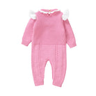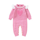 Keep your little one warm and stylish with this adorable knitted romper. Made from a soft and breathable cotton blend, this one-piece features a delicate heart pattern on the chest and charming ruffle sleeves in contrasting white. The ribbed neckline and cuffs offer a snug fit, while the cable-knit details on the legs add texture and warmth.