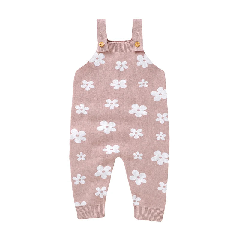 Dress your little one in comfort and style with this adorable knitted baby romper. Made from soft, breathable fabric, this sleeveless one-piece features a charming white daisy pattern on a muted pink background. The ribbed hems and wooden button straps add a touch of natural detail, while the stretchable knit ensures ease of movement for growing babies. Perfect for everyday wear, playdates, or as a thoughtful gift for newborns and toddlers.
