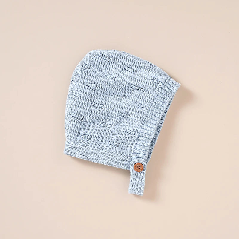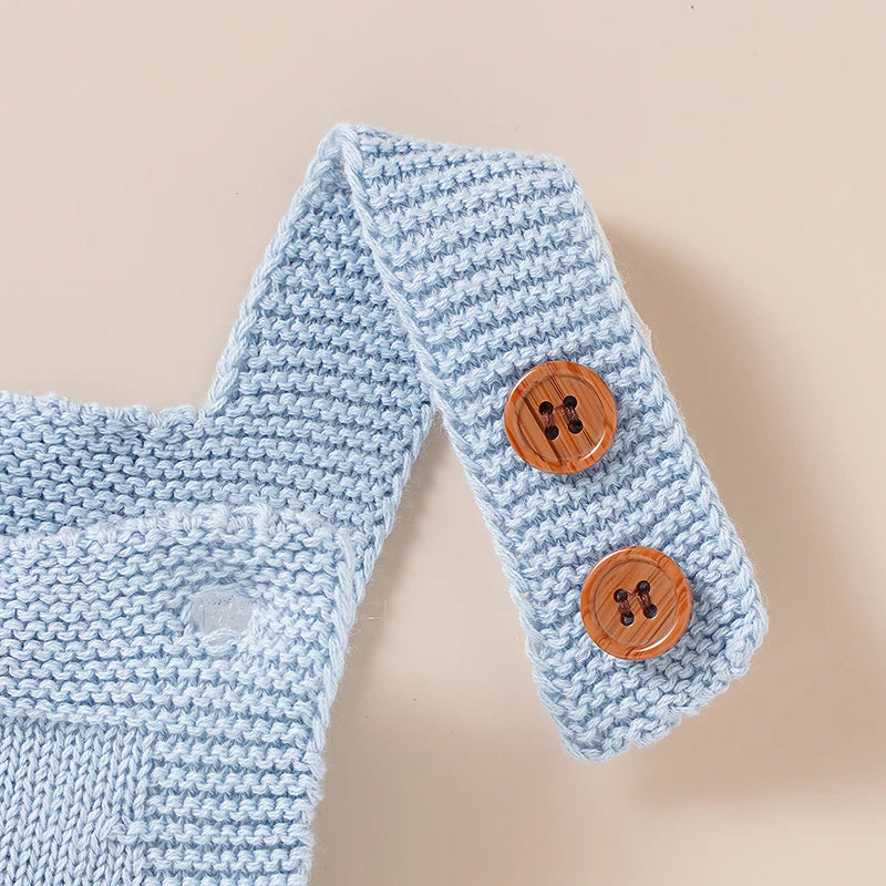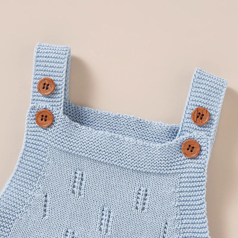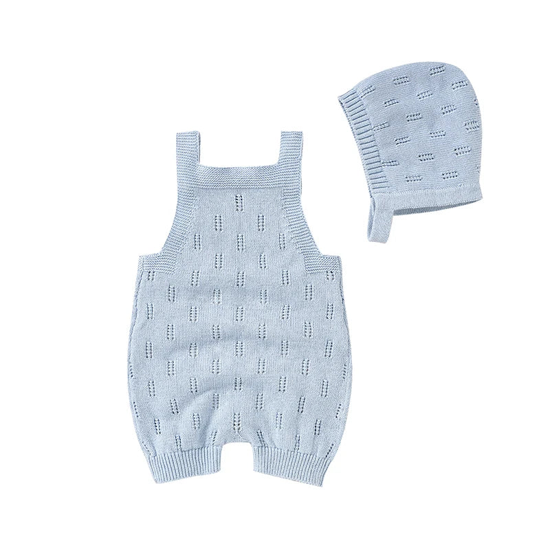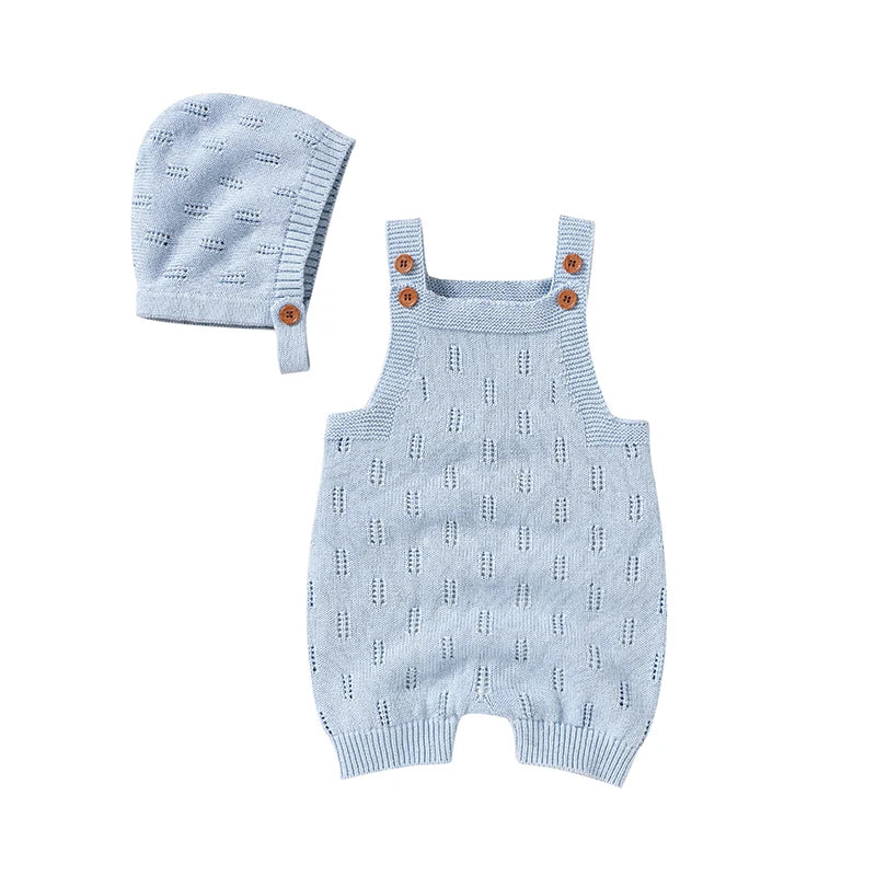 Add a timeless charm to your baby's wardrobe with this adorable knitted baby romper and hat set. Made from a soft and breathable cotton blend, this sleeveless romper features a delicate open-knit texture and wooden button closures on the shoulders and sides for easy changing.