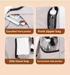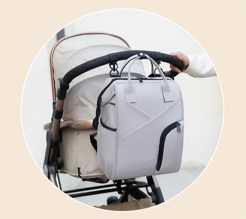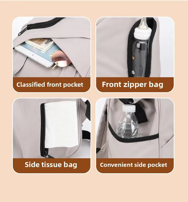 Crafted from durable, waterproof fabric, it features multiple compartments including insulated bottle holders, a wet pocket, and side pockets for quick access to wipes. The structured design makes packing and organizing easy, while padded shoulder straps and built-in stroller straps ensure convenient and comfortable carrying on the go.