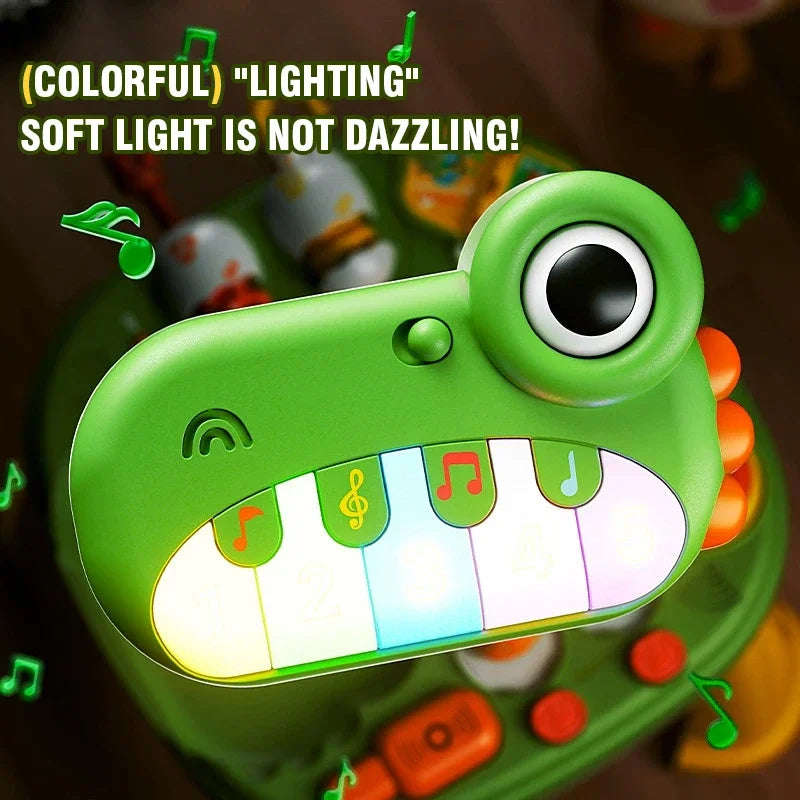 The activity table includes a colorful dinosaur theme with a light-up keyboard, musical notes, sound effects, and various interactive elements such as spinning gears, a dinosaur book, sensory eggs, and pop-up figures. It helps improve fine motor skills, hand-eye coordination, auditory learning, and cognitive development.