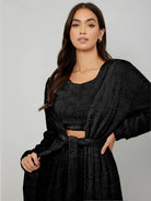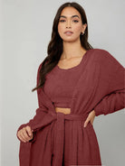 Set includes: 3 pieces – crop top, high-rise pants & matching long cardigan robe with tie belt