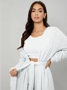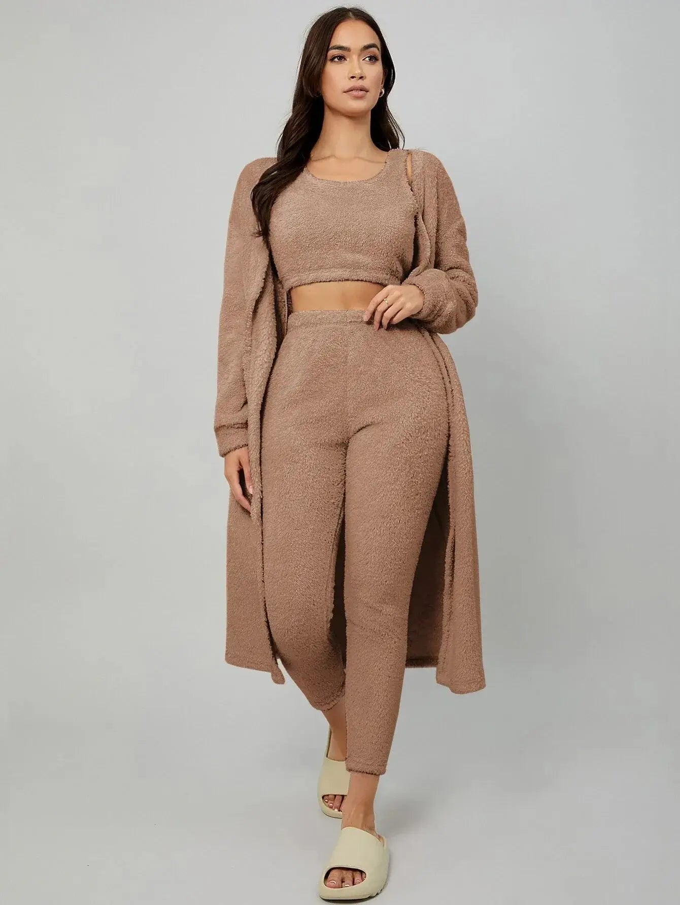 Wrap yourself in warmth and softness with this cozy 3-piece bouclé knit lounge set for women. This matching loungewear set features a sleeveless crop top, high-waisted fitted pants, and a long belted cardigan robe, all made from ultra-soft, stretchy bouclé knit fabric. Perfect for relaxing at home, running errands, or traveling in comfort, this stylish lounge outfit blends elevated style with luxurious comfort.
