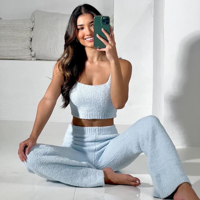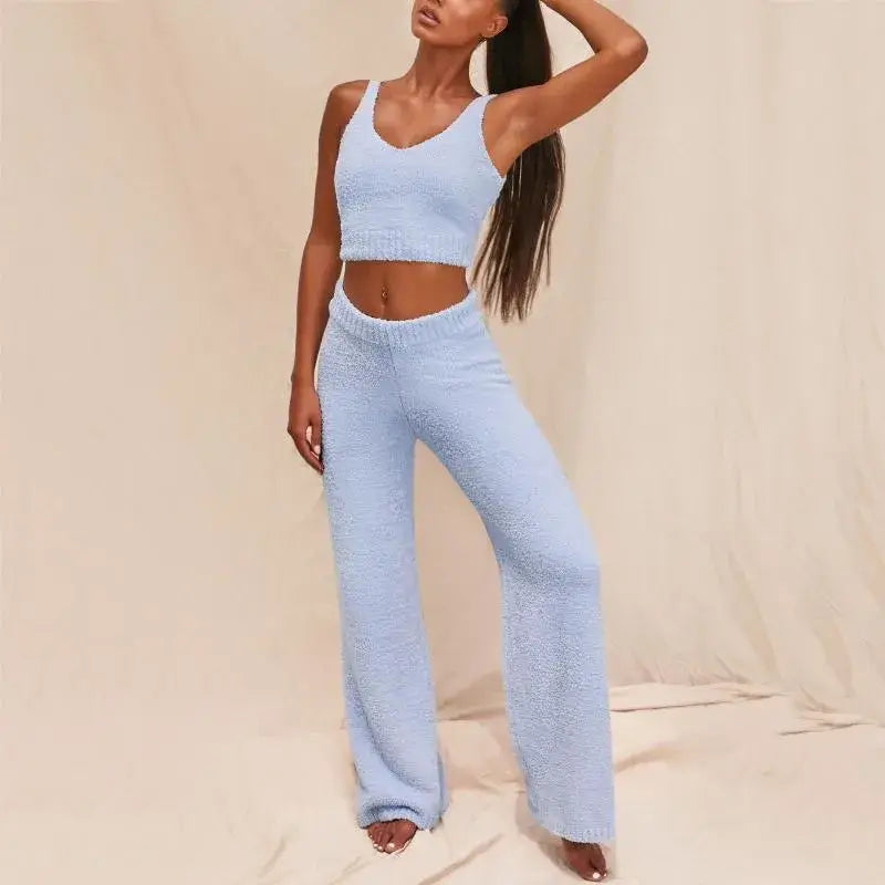 Indulge in everyday comfort with this ultra-soft bouclé knit lounge set for women, crafted for effortless style and cozy relaxation. Made from 100% stretchy bouclé knit, this matching two-piece set features a flattering cropped tank top and high-waisted wide-leg pants designed to hug your curves while offering a relaxed, breathable fit.