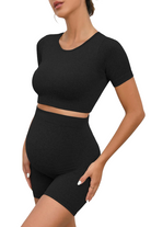 The set includes a short-sleeve cropped top and matching high-waisted shorts, both crafted with a seamless ribbed texture that contours gently to your shape. The elastic waistband provides gentle belly support without digging in, making it ideal for relaxing at home, running errands, or light workouts like yoga or walking.