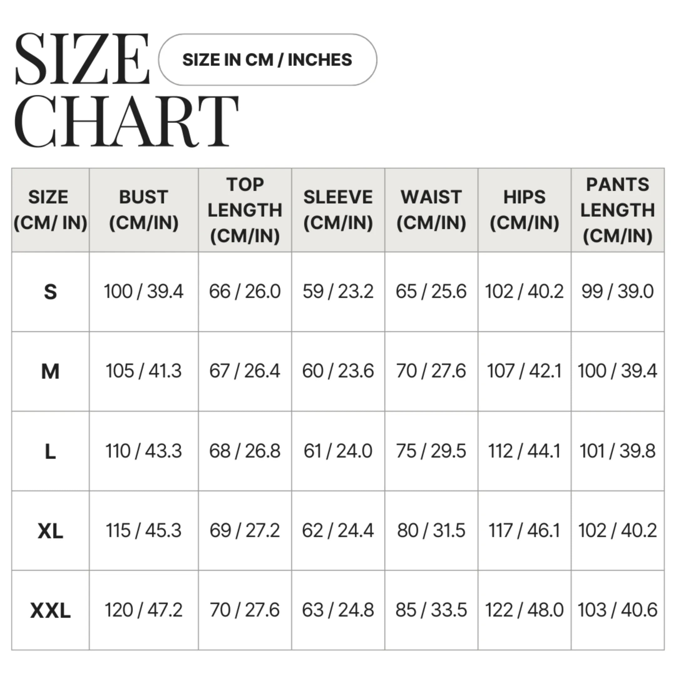| Size | Bust | Top Length | Sleeve | Waist | Hips | Pants Length |