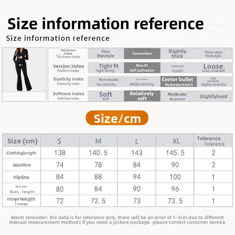 Available in sizes S to XL, with a high-waist cut and bootcut flared legs, this piece enhances your silhouette without compromising on comfort. The inner seam and bust dimensions are thoughtfully measured to accommodate the changing body during and after pregnancy.