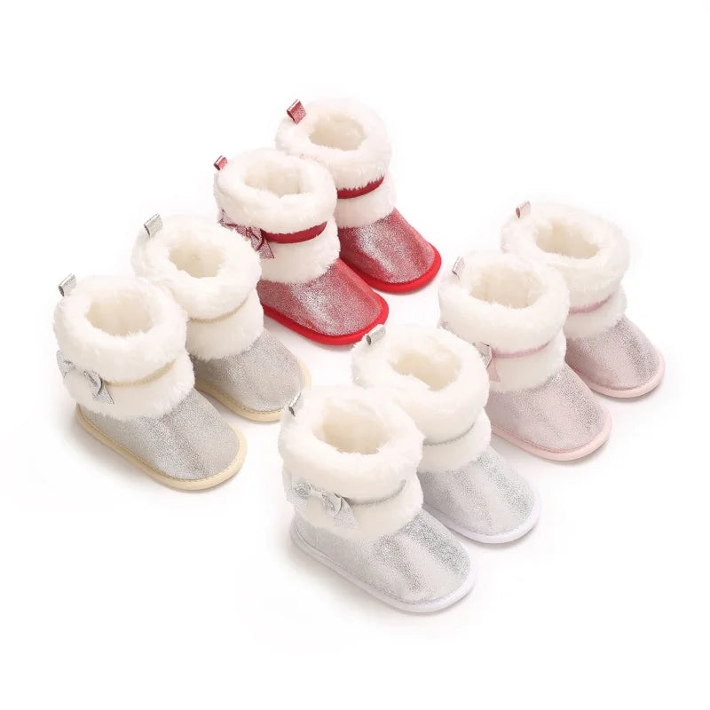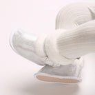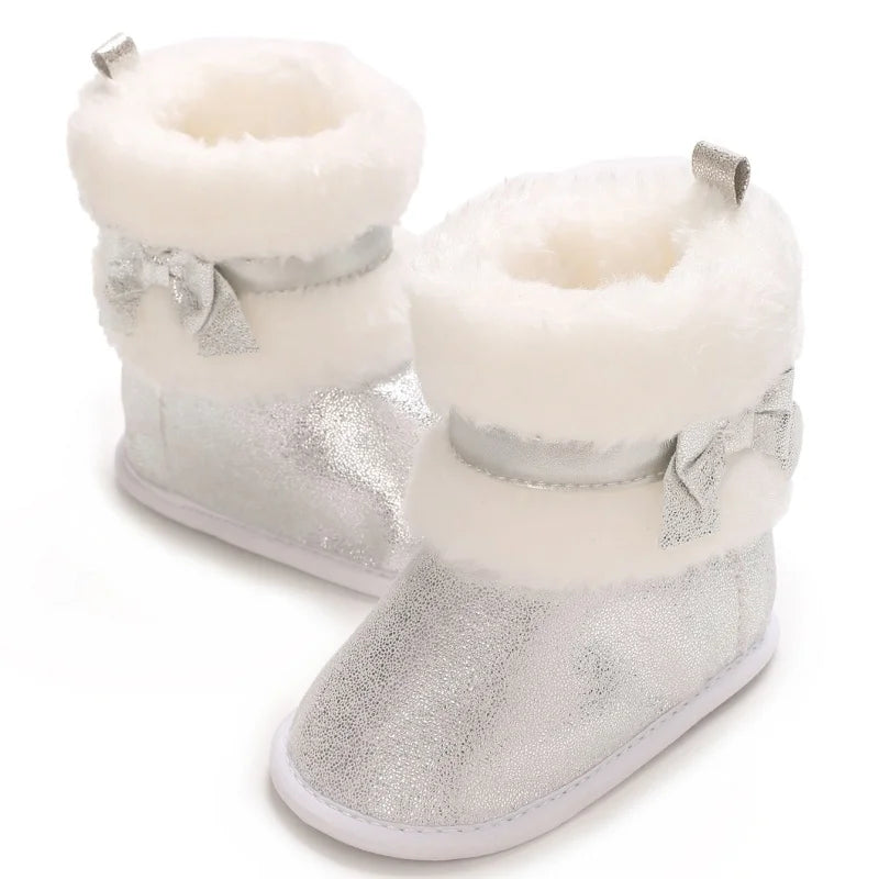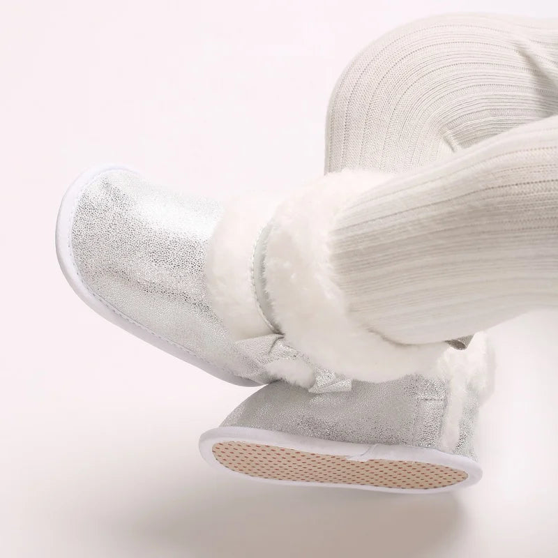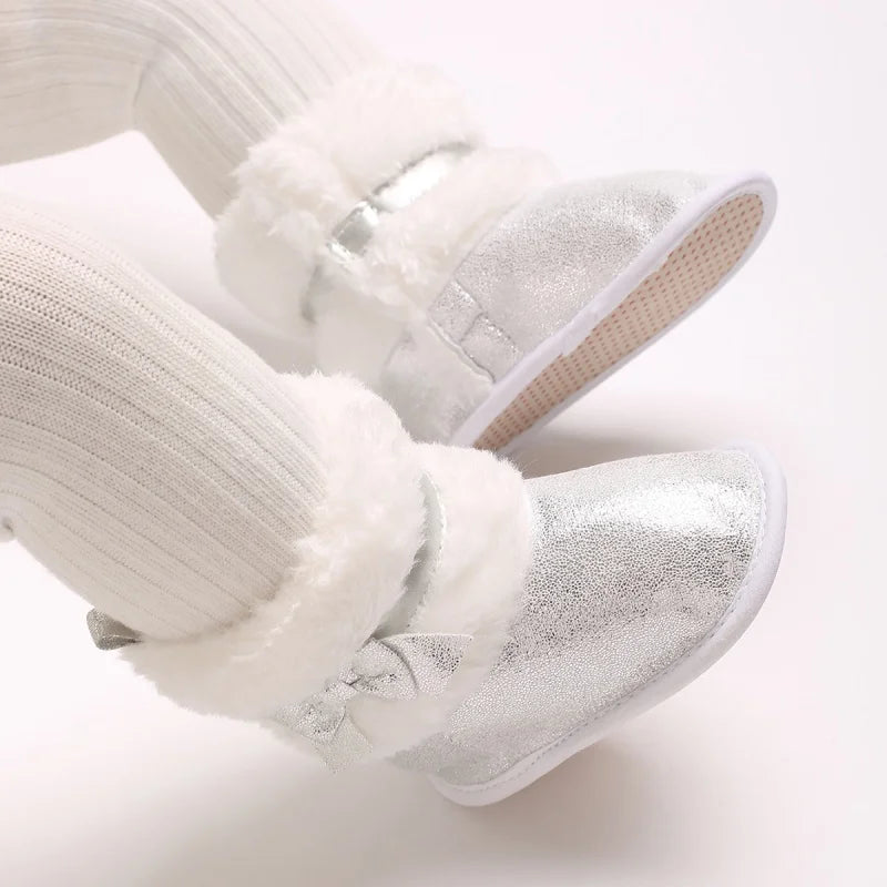 Crafted entirely without leather, these boots are lightweight, animal-friendly, and easy to wear. A delicate bow detail and metallic finish add a stylish touch, while the pull tab ensures hassle-free dressing. Ideal for babies aged 0–18 months, these winter booties combine function and fashion for the colder season.