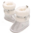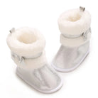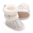 Add sparkle and warmth to your baby's winter wardrobe with these shiny silver baby boots. Made from synthetic materials with a soft faux fur lining, these infant shoes provide both comfort and eye-catching style. The boots feature a flexible soft sole with anti-slip grip, making them perfect for first steps or indoor play.