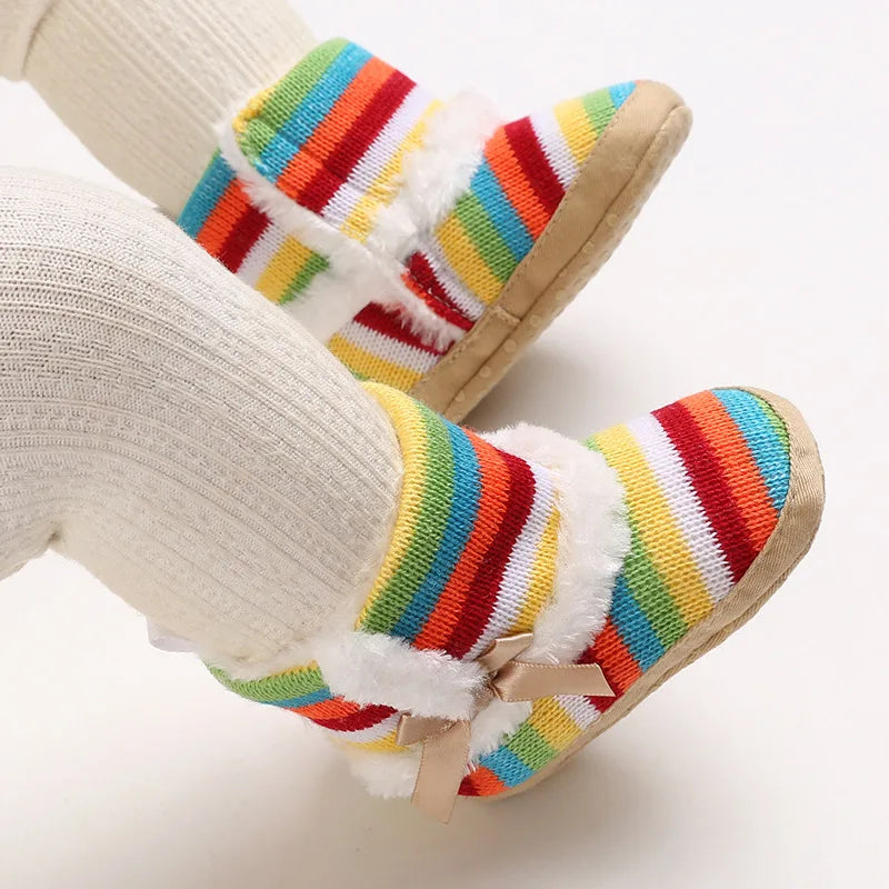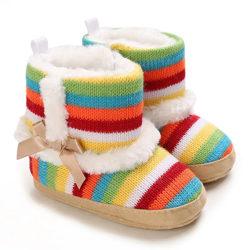 Protect your baby’s feet from the cold with these warm, plush-lined baby booties, featuring a soft sole and a colorful knitted acrylic upper. Designed with bold rainbow stripes, a faux fur lining, and an elegant satin bow, these infant shoes offer both comfort and style for little ones learning to crawl or take their first steps.